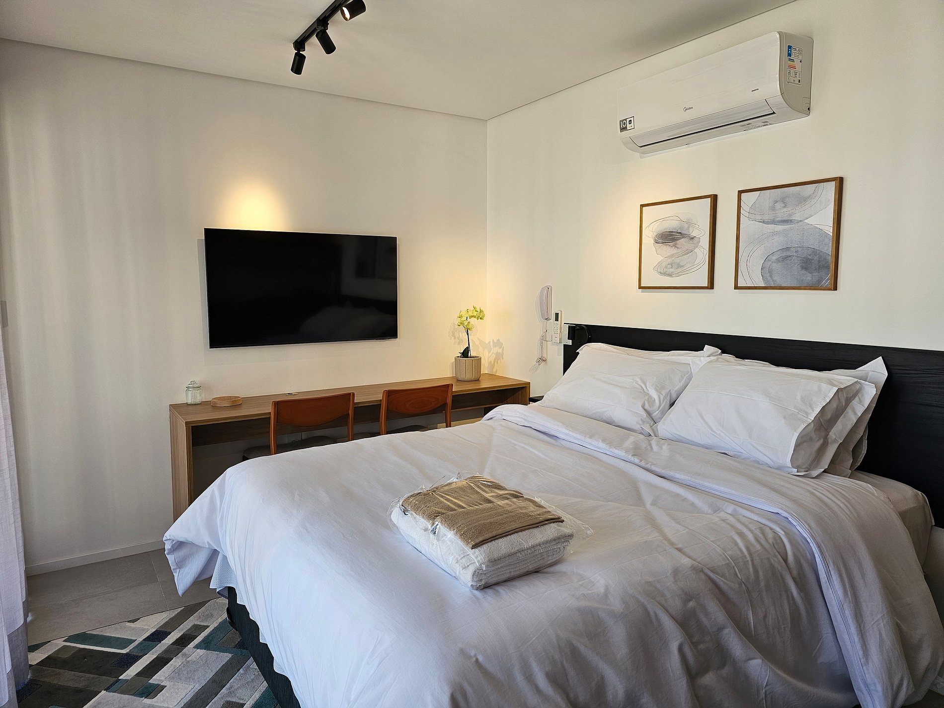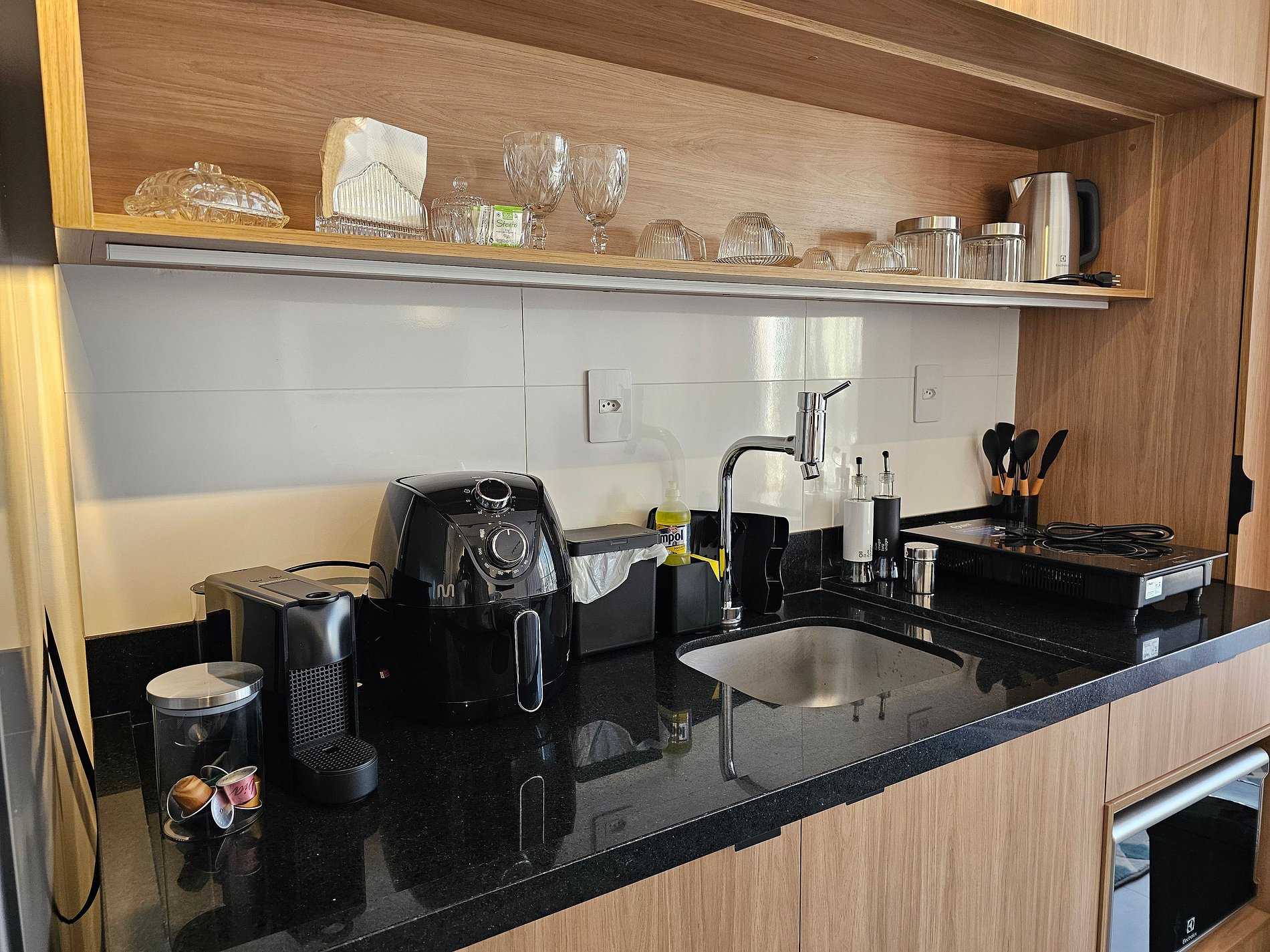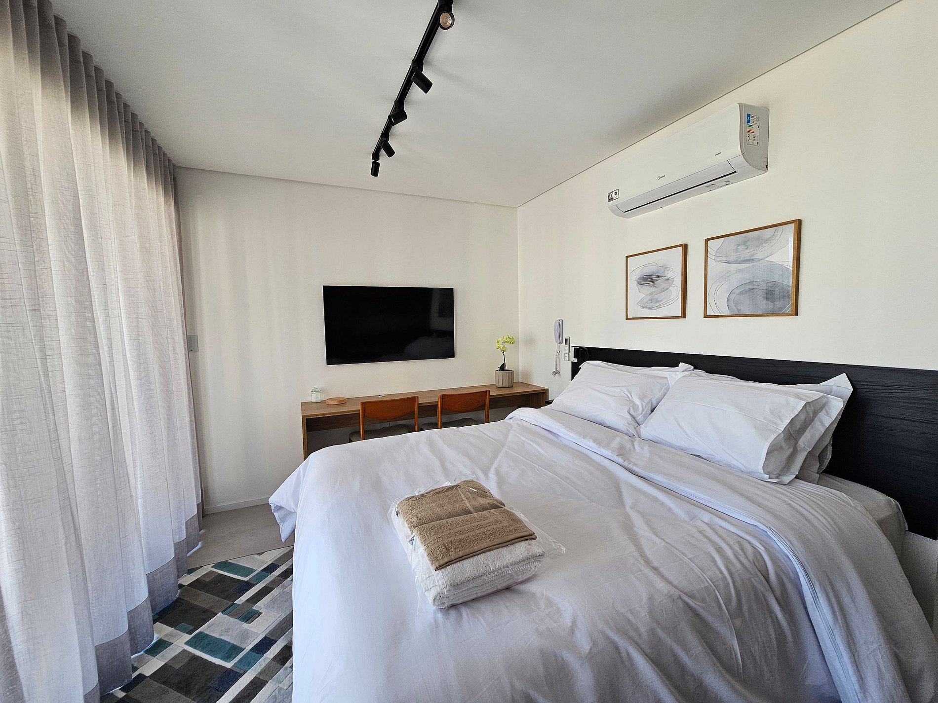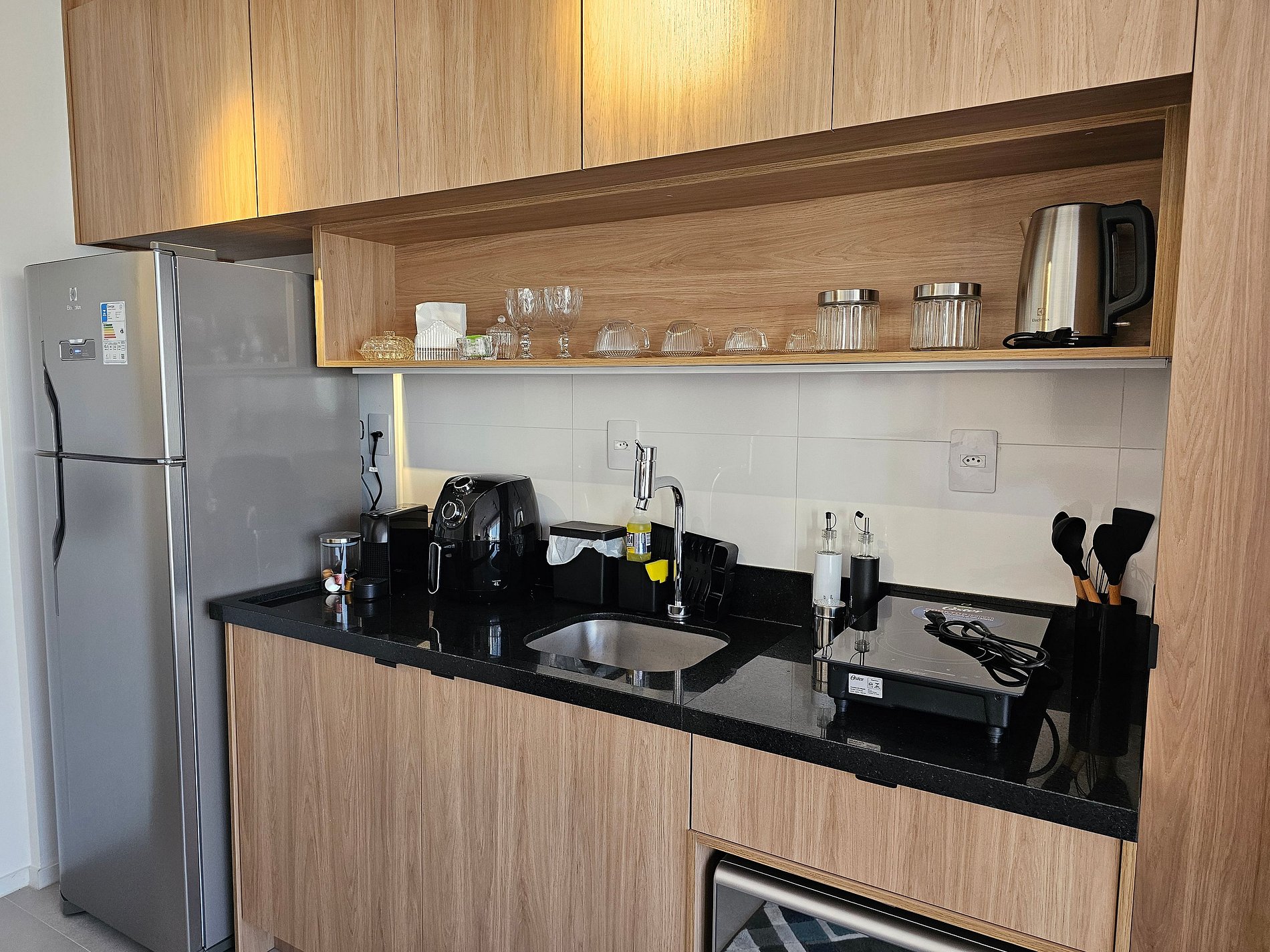 O studio foi planejado para oferecer conforto e praticidade em cada detalhe. Totalmente mobiliado, conta com uma cozinha completa, cama confortável, TV, Wi-Fi e ar-condicionado. O ambiente é moderno, bem iluminado e ideal tanto para estadias curtas quanto longas. Além disso, o prédio oferece segurança e comodidade, garantindo uma experiência agradável e tranquila.