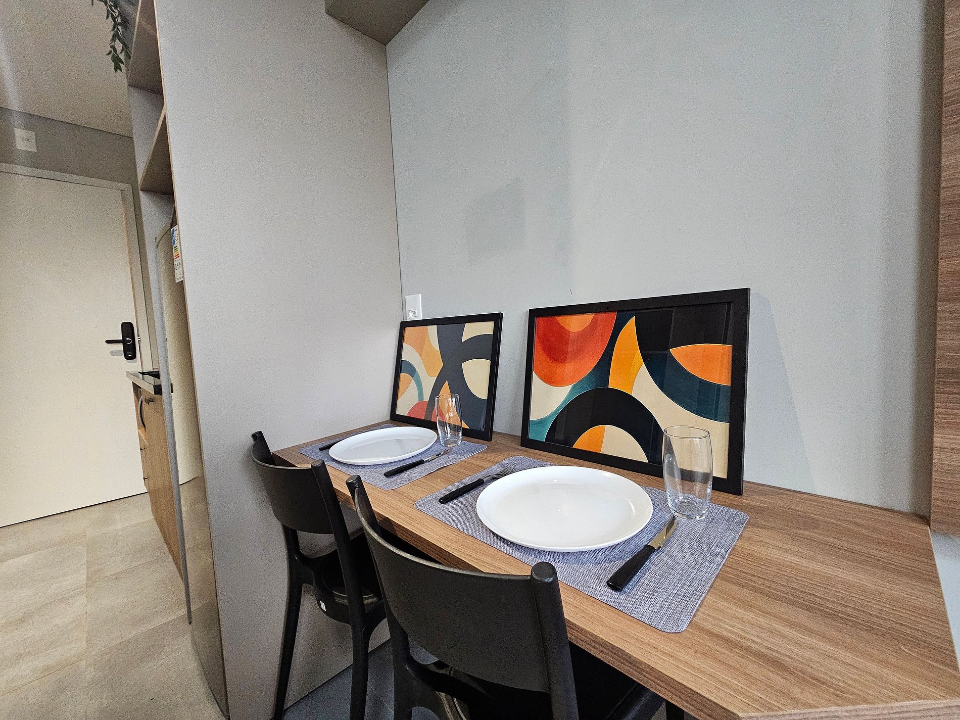 Studio completo e pronto para morar, com todos os itens essenciais para o seu conforto: cozinha equipada, enxoval de cama e banho, Wi-Fi, TV e ar-condicionado. Próximo a comércios, restaurantes e shoppings. Ideal para quem busca praticidade e bem-estar em um ambiente moderno e funcional.