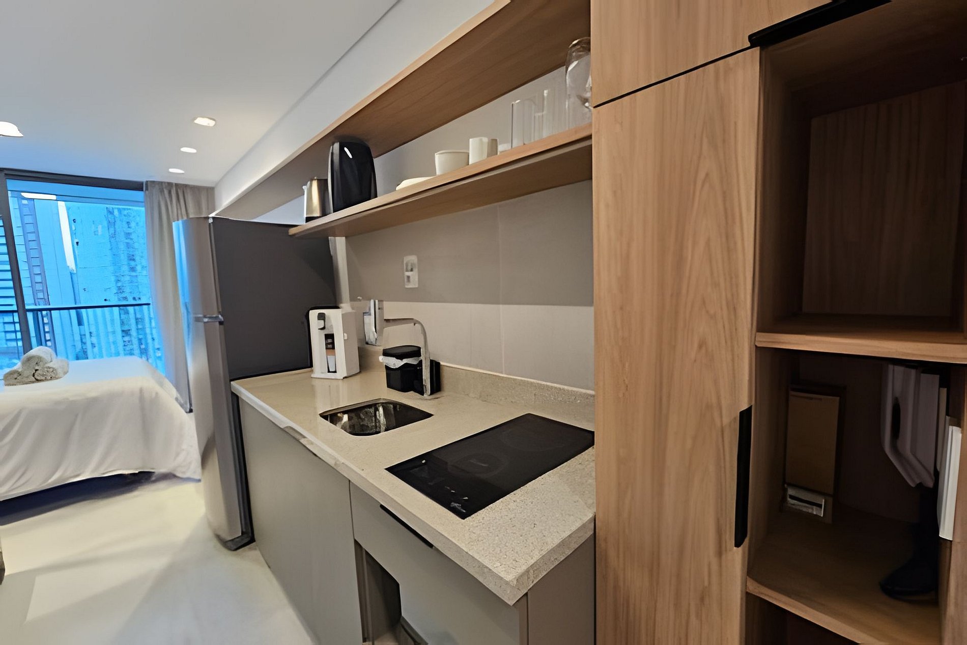 O studio foi planejado para oferecer conforto e praticidade em cada detalhe. Totalmente mobiliado, conta com uma cozinha completa, cama confortável, TV, Wi-Fi e ar-condicionado. O ambiente é moderno, bem iluminado e ideal tanto para estadias curtas quanto longas. Além disso, o prédio oferece segurança e comodidade, garantindo uma experiência agradável e tranquila.