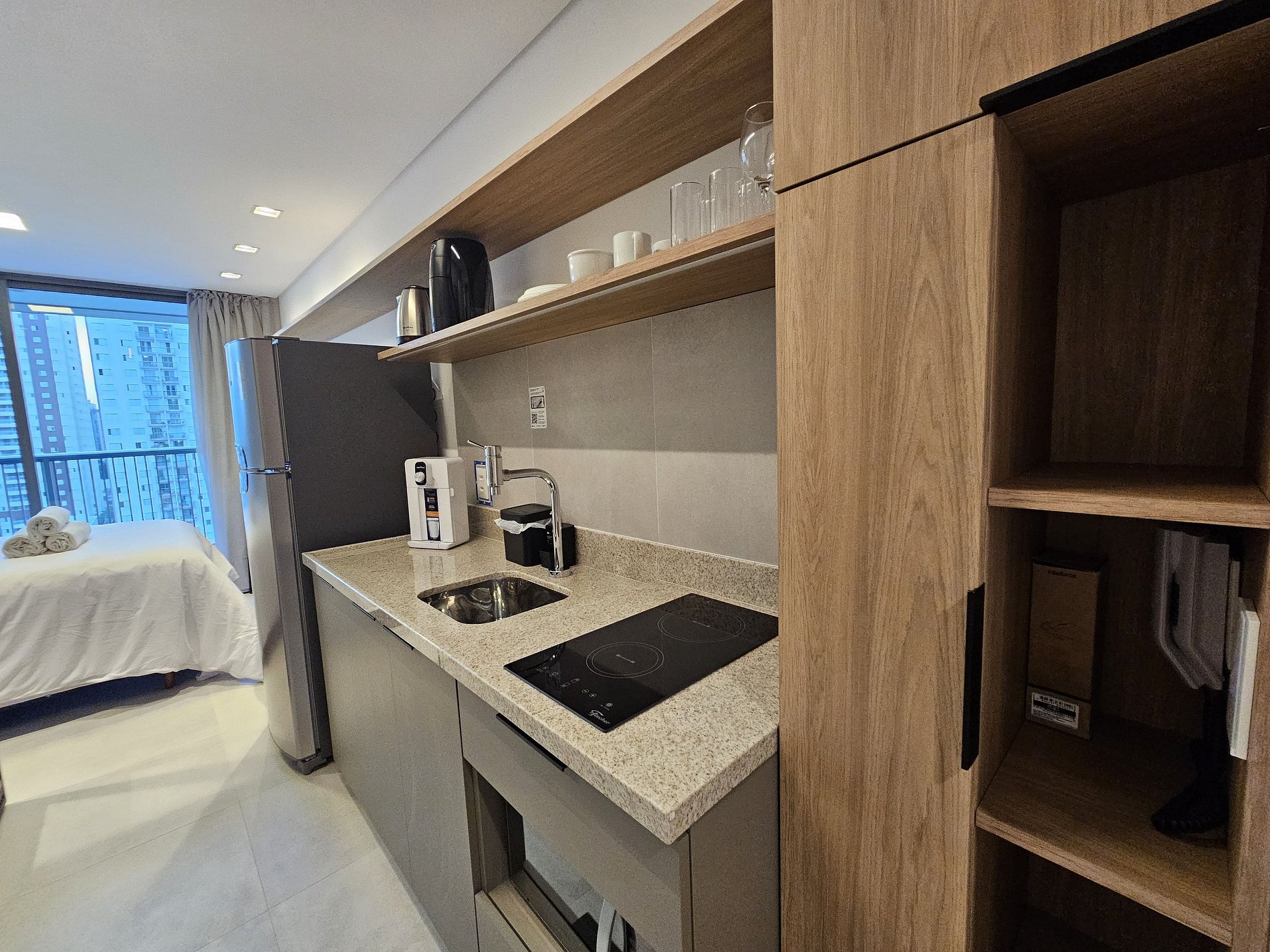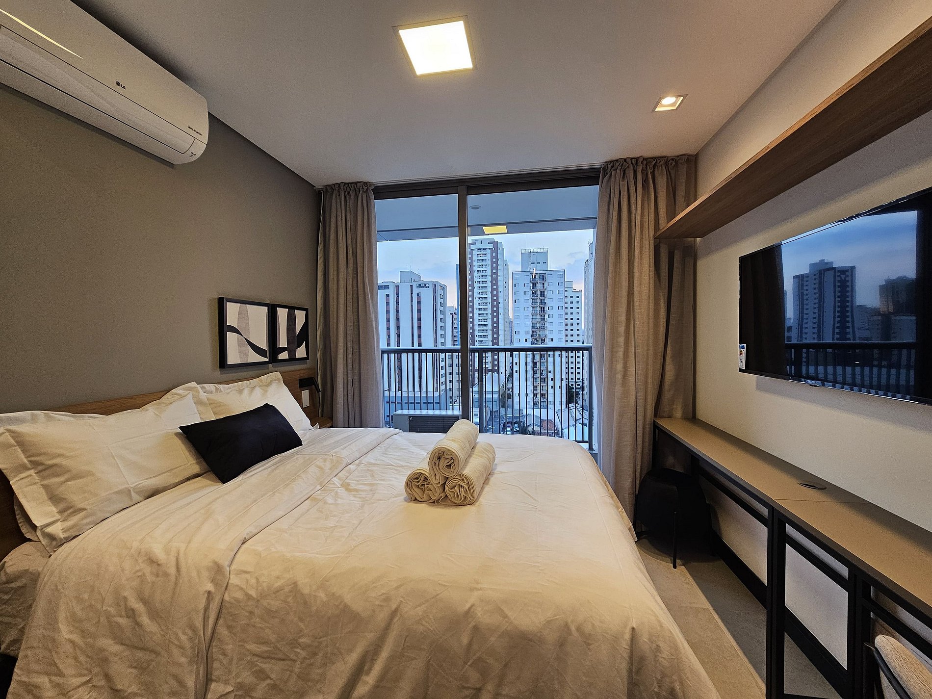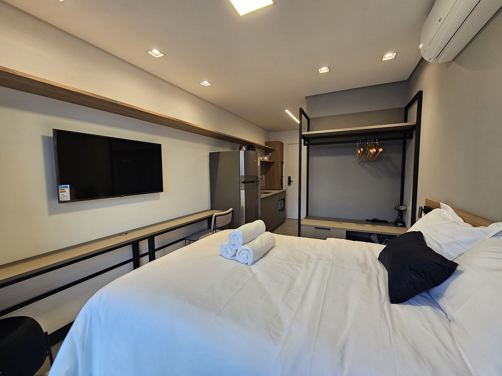 Studio completo e pronto para morar, com todos os itens essenciais para o seu conforto: cozinha equipada, enxoval de cama e banho, Wi-Fi, TV e ar-condicionado. Próximo a comércios, restaurantes e shoppings. Ideal para quem busca praticidade e bem-estar em um ambiente moderno e funcional.