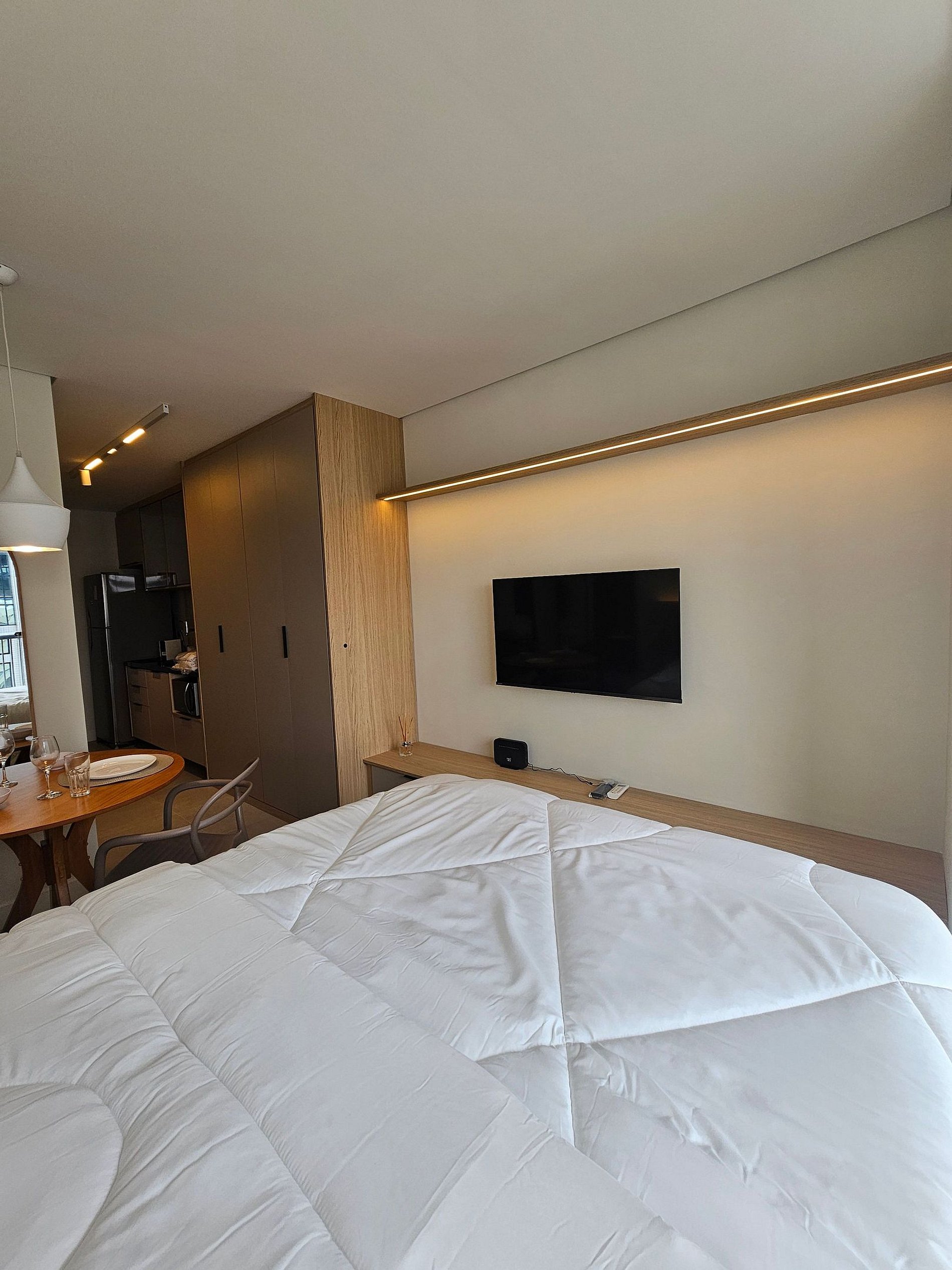 O studio foi planejado para oferecer conforto e praticidade em cada detalhe. Totalmente mobiliado, conta com uma cozinha completa, cama confortável, TV, Wi-Fi e ar-condicionado. O ambiente é moderno, bem iluminado e ideal tanto para estadias curtas quanto longas. Além disso, o prédio oferece segurança e comodidade, garantindo uma experiência agradável e tranquila.