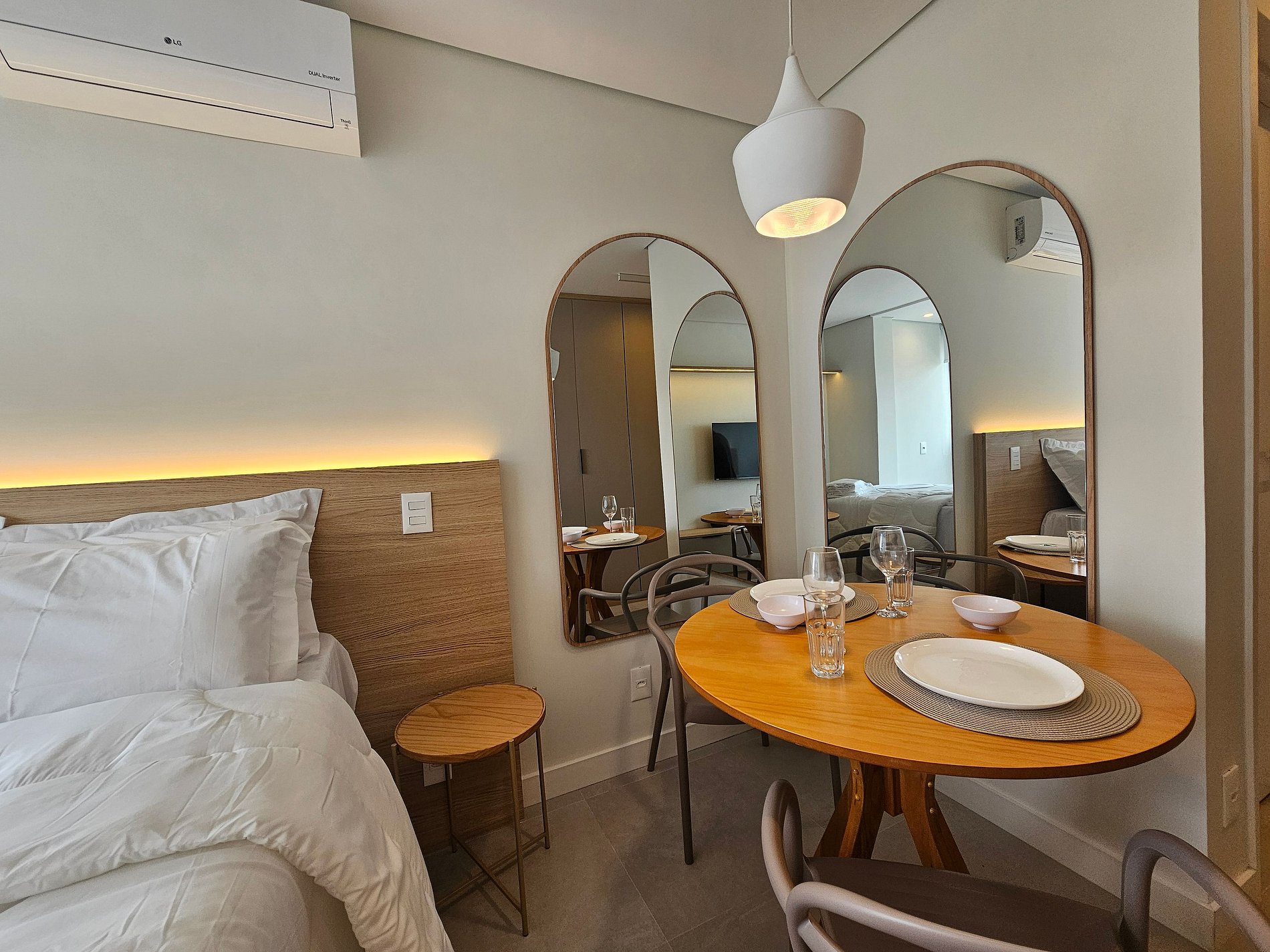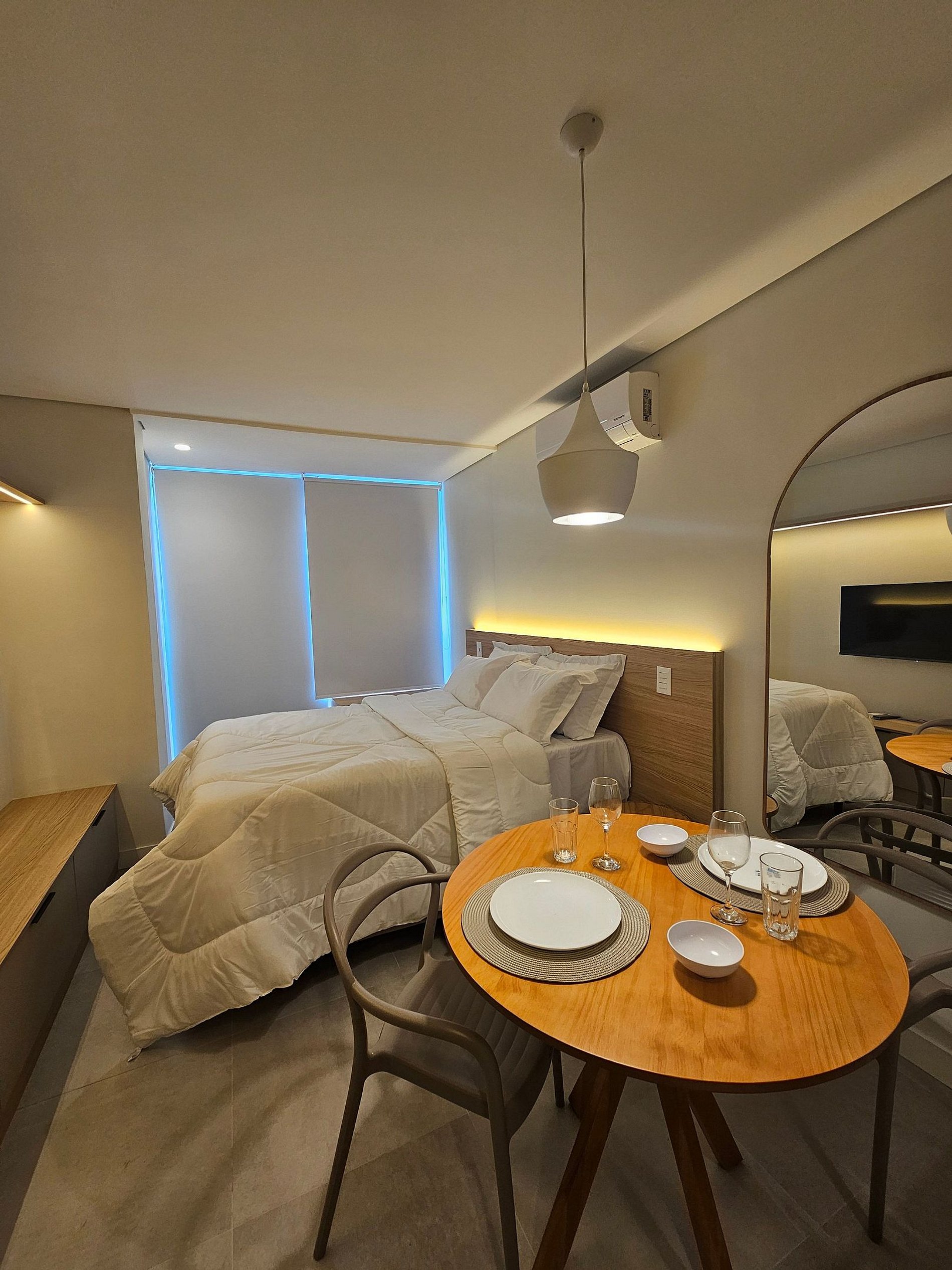 O studio foi planejado para oferecer conforto e praticidade em cada detalhe. Totalmente mobiliado, conta com uma cozinha completa, cama confortável, TV, Wi-Fi e ar-condicionado. O ambiente é moderno, bem iluminado e ideal tanto para estadias curtas quanto longas. Além disso, o prédio oferece segurança e comodidade, garantindo uma experiência agradável e tranquila.