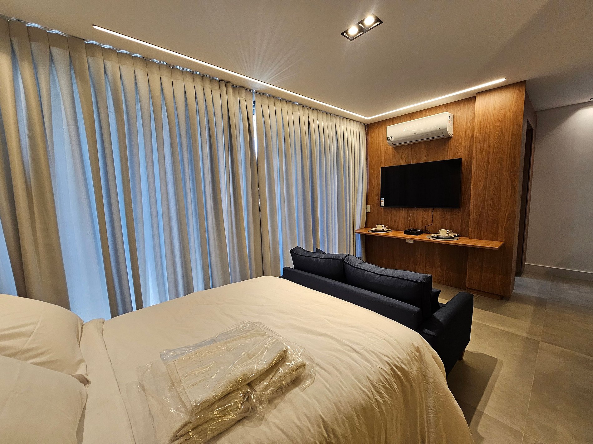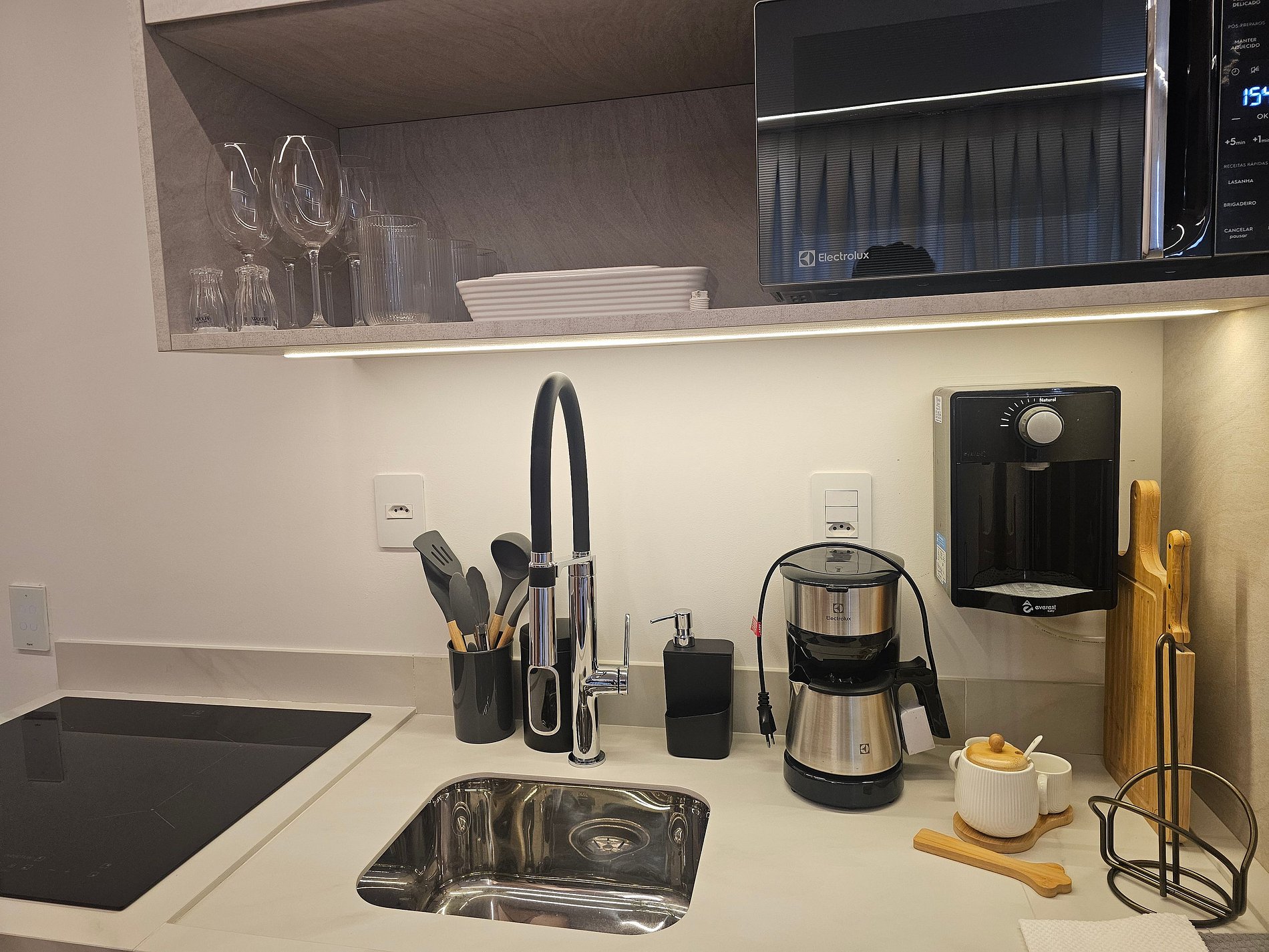 Studio completo, moderno e funcional Enxoval premium: roupas de cama e banho de alta qualidade Cozinha equipada com utensílios e eletrodomésticos Wi-Fi, ar-condicionado e Smart TV Ideal para estadias curtas ou longas Localização privilegiada no Tatuapé Próximo ao metrô, mercados, farmácias e restaurantes Ambiente aconchegante e pronto para uso