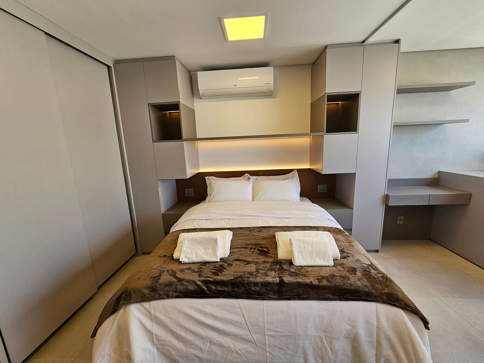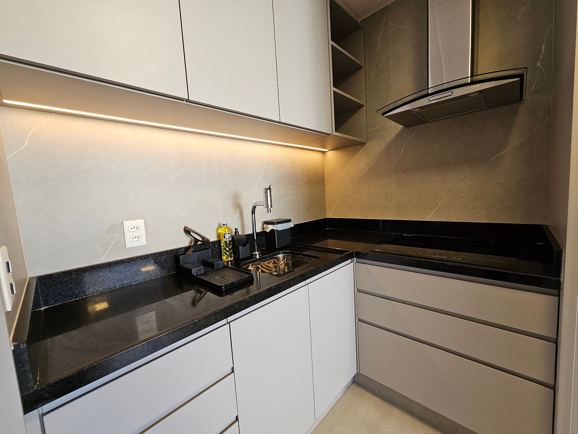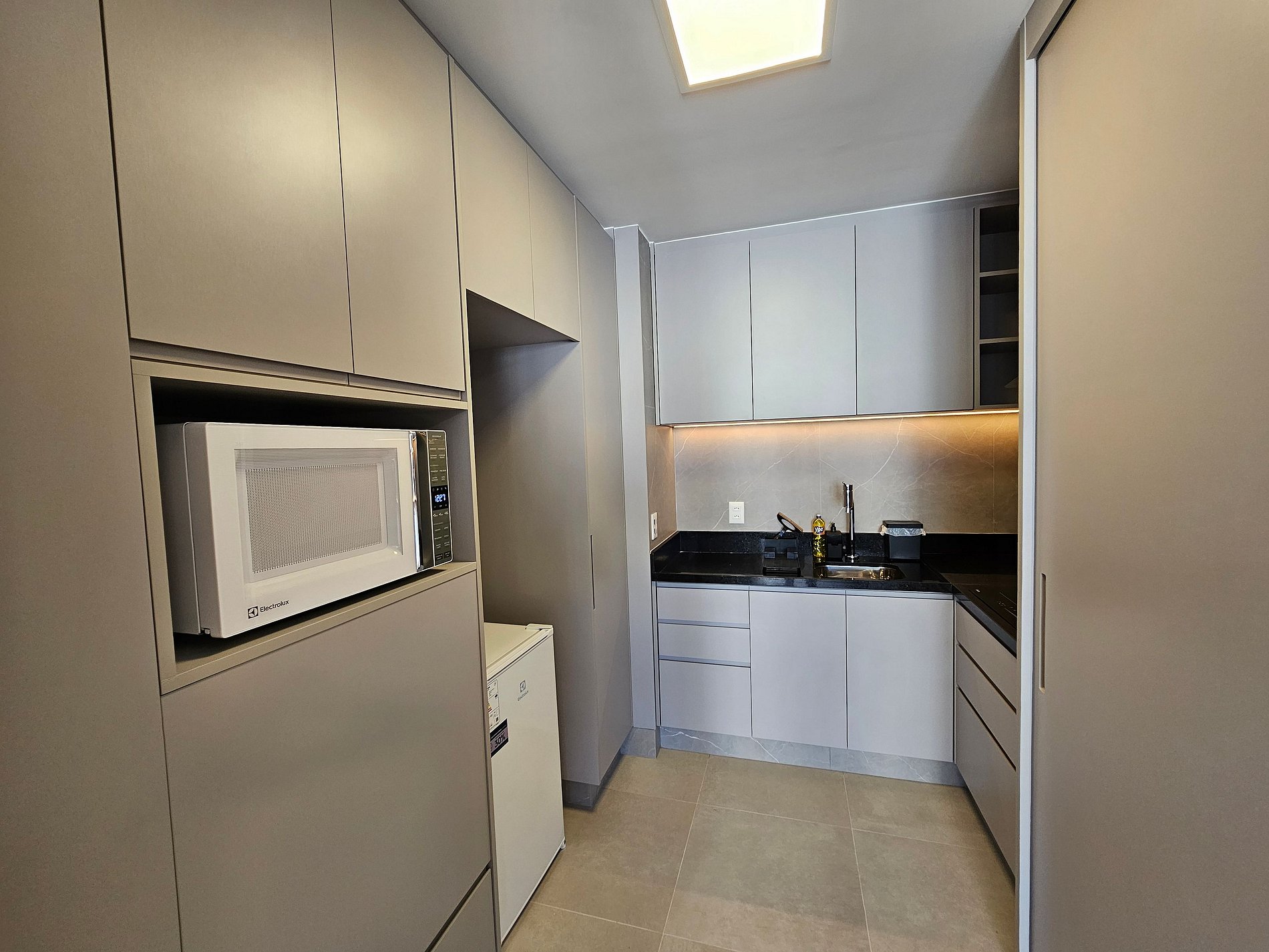 Cozinha equipada com eletrodomésticos e utensílios modernos, além de enxoval de cama e banho premium, proporcionando uma experiência de hospedagem com padrão de hotel 5 estrelas.
